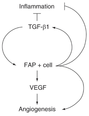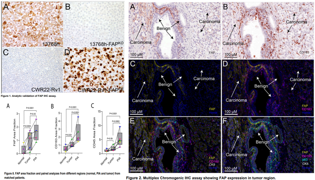 We have documented that while FAP is nearly absent in benign regions, it is consistently present in areas of proliferative inflammatory atrophy (PIA), a prostate cancer precursor legion. In prostate cancer, FAP was expressed in all cases, however, it was highly heterogeneous. High FAP levels were associated with increased pathological stage, cribriform morphology, and correlated with CD163+ M2 macrophage density.
